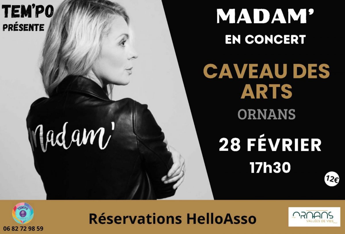 Accompagnée par deux musiciens, Madam' chante la vie à chacun et la vie de chacun. Á la fois sensible et passionnée, elle raconte, défend, dénonce parfois.
