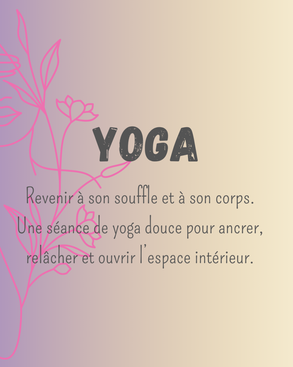 Au programme : • Une séance de yoga pour réveiller le corps et apaiser le mental et s’ancrer • Des ateliers d’art-thérapie et de vision board pour laisser émerger tes envies et ta vision du bonheur • Des massages assis pour relâcher les tensions et t’évader • Un cercle de femmes pour t’exprimer, écouter et te relier aux autres • Des instants de convivialité autour d’un déjeuner partagé et de temps d’échanges