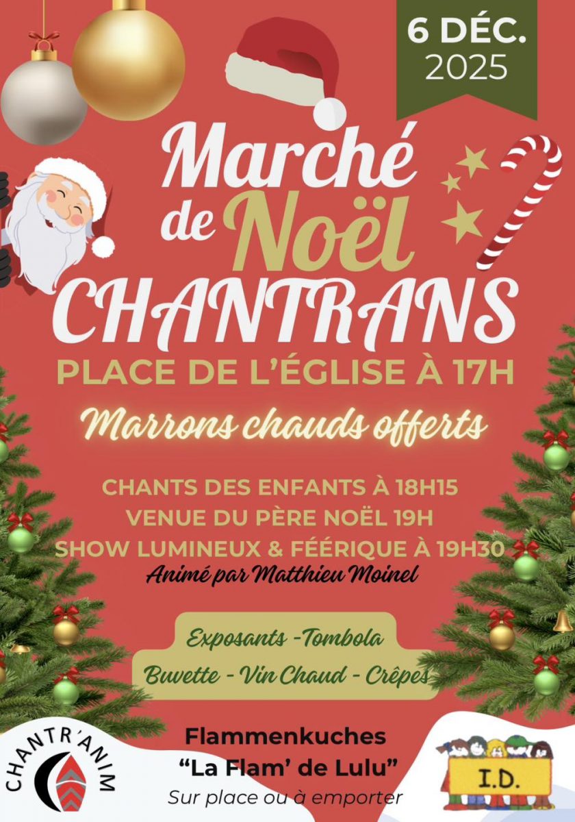 Le Marché de Noël de Chantrans débarque le 6 décembre 2025 à 17h – Place de l’Église. On a même prévenu la NASA, au cas où ça parte en orbite. * 18h15 – Chants des enfants * 19h – Père Noël * 19h30 – Show lumineux * Marrons chauds gratuits /Vin chaud – Crêpes – Buvette * Flammenkuches “La Flam’ de Lulu” * Exposants + Tombola - Ambiance : Matthieu Moinel Plus énergique qu’un lutin sous Red Bull. - Viens (même en pull moche). - Ne viens pas sans esprit de Noël.
