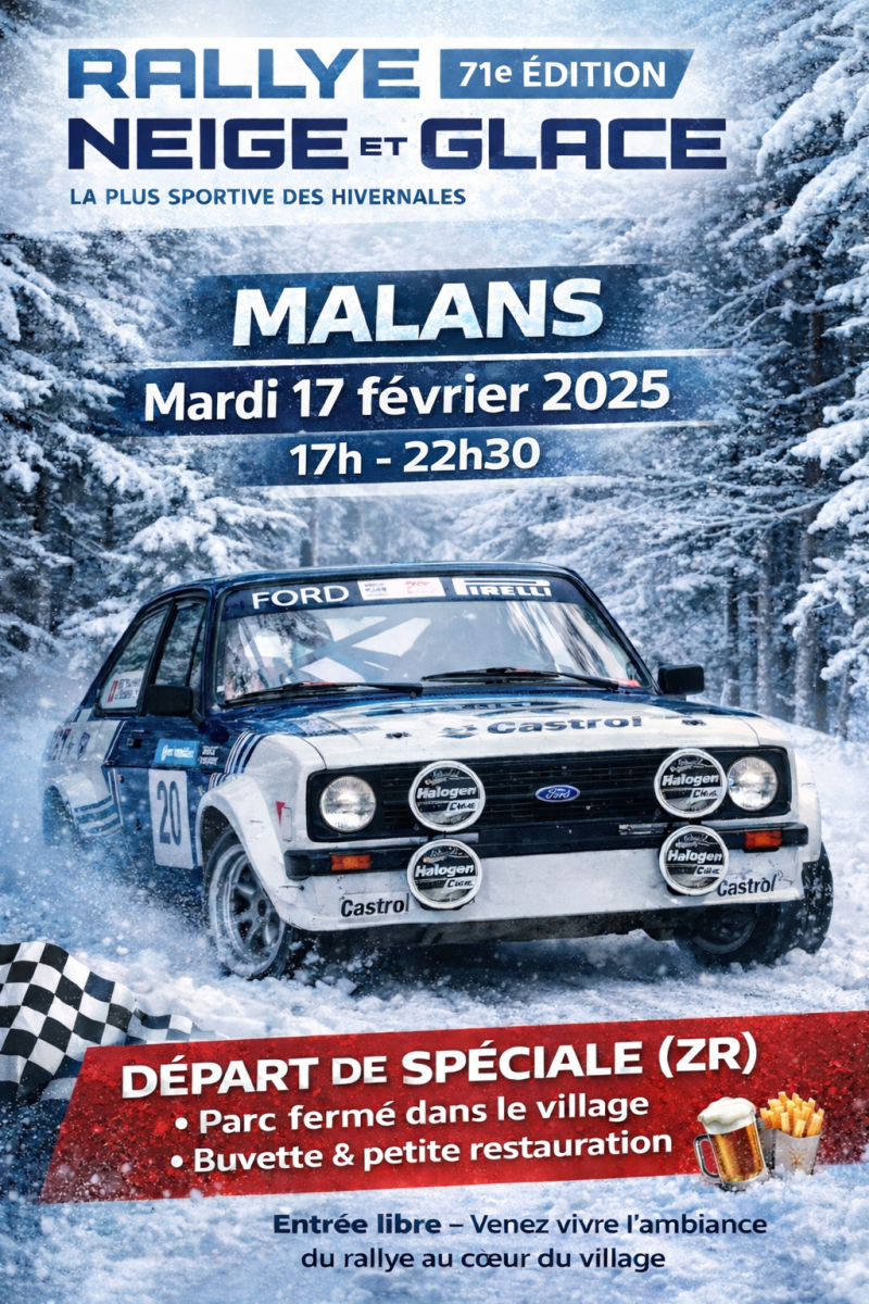 Passage du Rallye Neige et Glace à Malans - Parc de regroupement, départ et slalom vous attendent ! Sans oublier la buvette et petite restauration sur place .