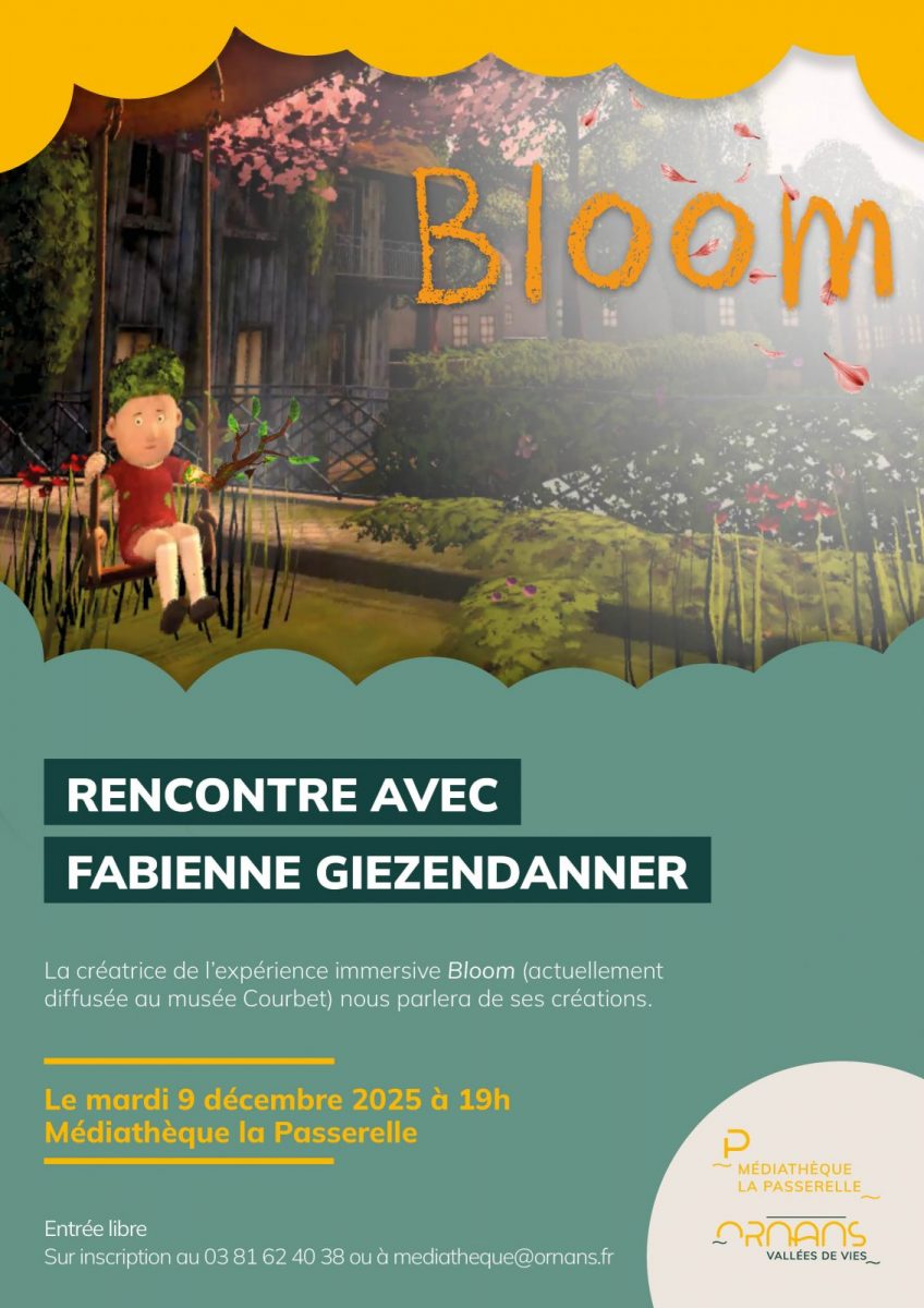 La médiathèque La Passerelle vous convie à une rencontre avec Fabienne Giezendanner, la créatrice de l'expérience immersive Bloom actuellement projetée au musée Courbet. Elle sera présente pour échanger avec vous à propos de ses créations, et notamment de Bloom.