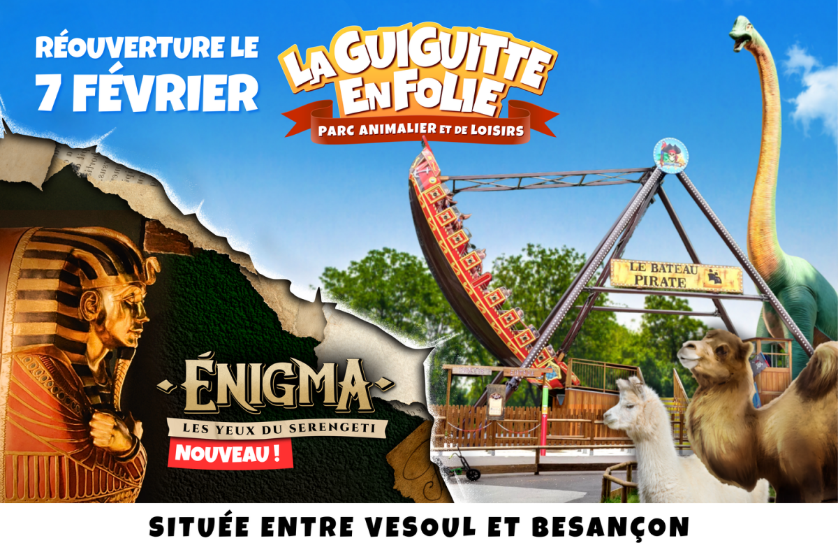 Le Parc Guiguitte en Folie, situé entre Besançon et Vesoul, est un parc animalier et de loisirs familial. Sur 9 hectares, il propose la découverte d’animaux, de nombreuses activités et attractions pour tous les âges et un parcours dédié aux dinosaures avec site de fouilles. Trois grands événements rythment l’année : Carnaval, Pâques et Halloween, avec animations et décors thématiques.