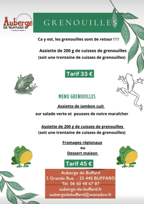 Depuis quelques jours, les cuisses de grenouilles sont de retour sur les cartes des restaurants de la vallée de la Loue ! Miam miam… En persillade ou simplement avec beaucoup de beurre… à vous de choisir !