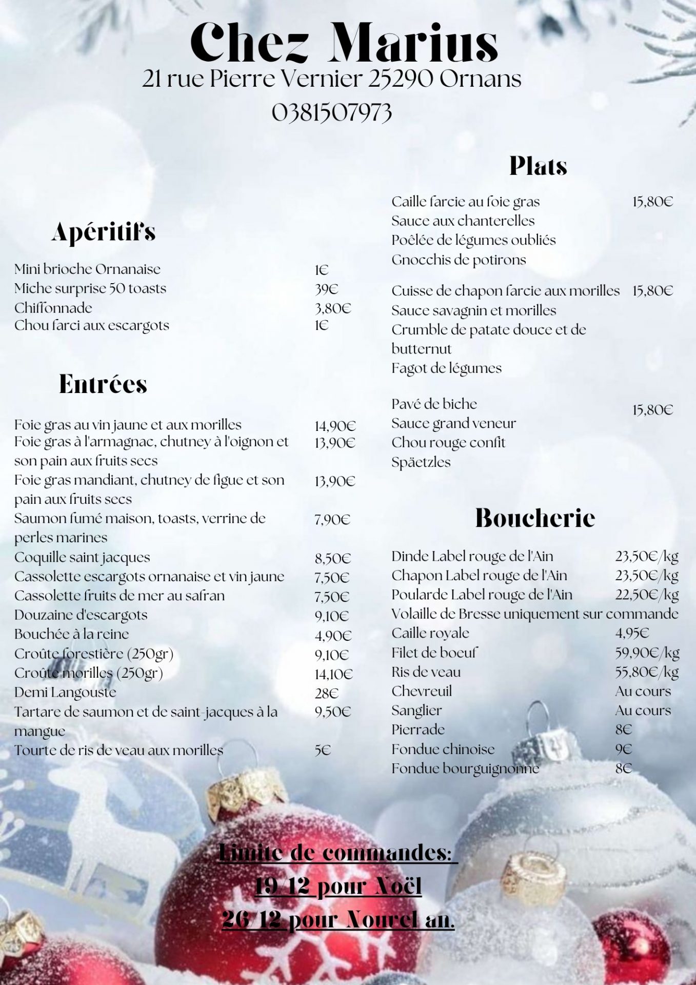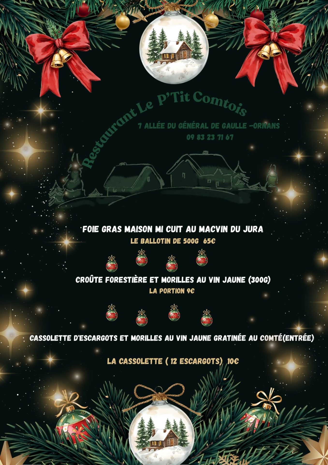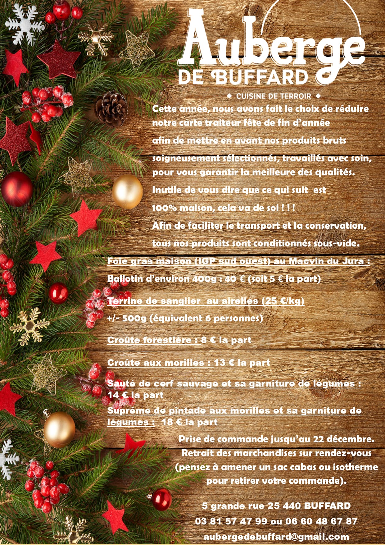Aurélie et Damien vous ont concocté une carte des plus festives : Truite, cerf, poulet au vin jaune, croûte forestière… tous les incontournables des fêtes de fin d’année à emporter.
