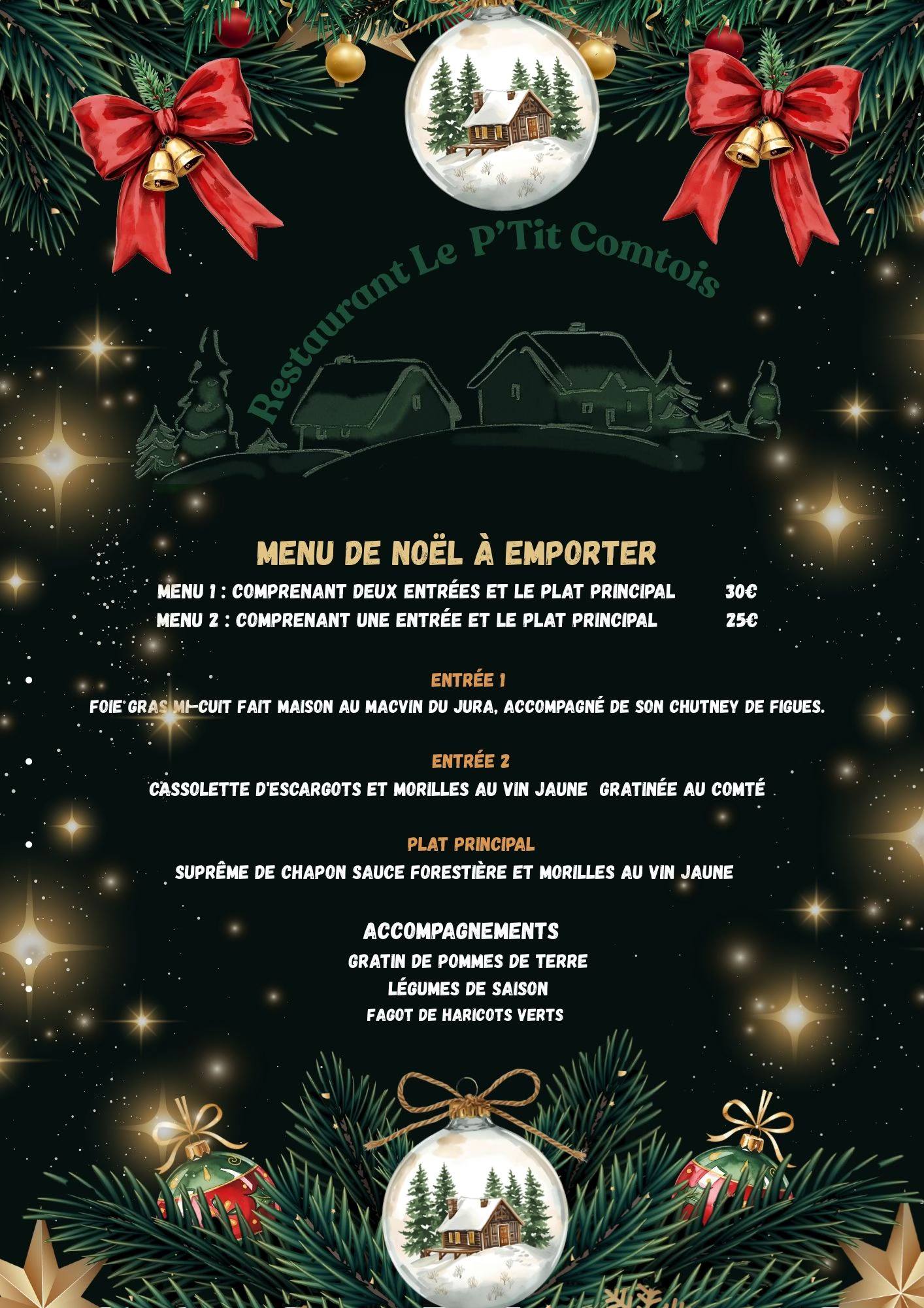 Consultez les entrées et les menus du réveillon du P’tit Comtois.