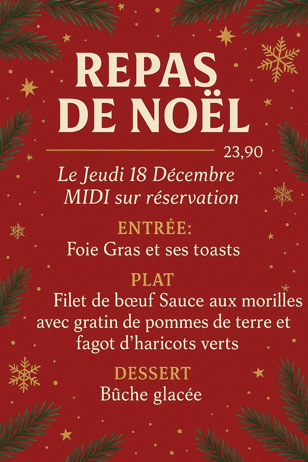 Pour ces fêtes de fin d’année, régalez-vous avec un repas festif, préparé avec soin et qui saura ravir vos papilles. Entrées raffinées et plats savoureux : tout est pensé pour vous offrir un moment inoubliable en famille ou entre amis !