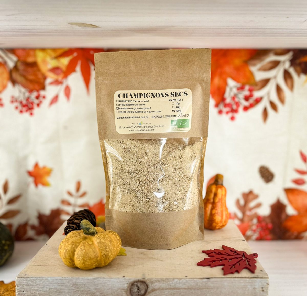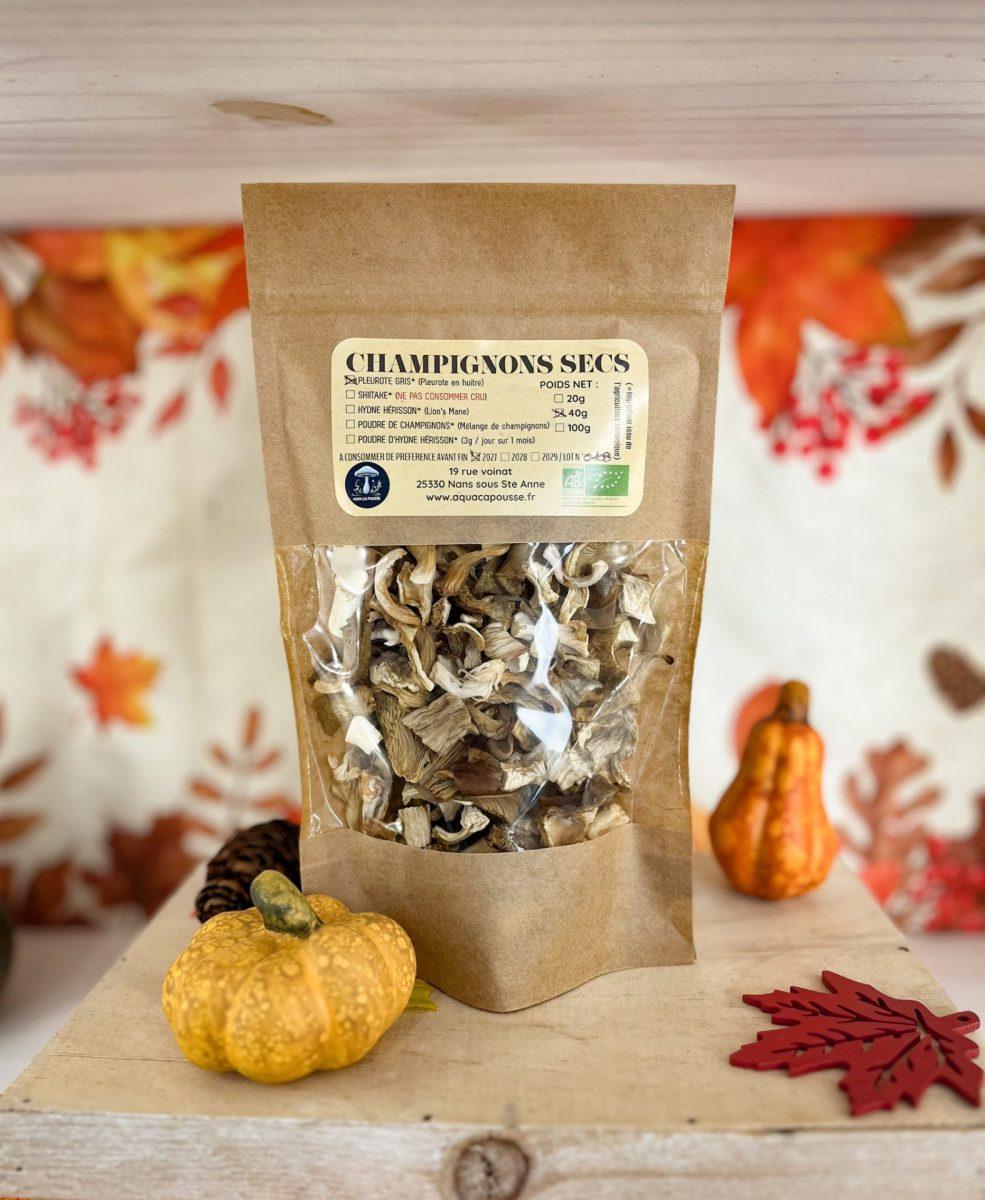 - Aqua ça Pousse : sachet de brisures de champignons secs -5€ et sachet de pleurotes gris à réhydrater – 6€ pour confectionner vos plats en sauce et autres croûtes aux champignons !