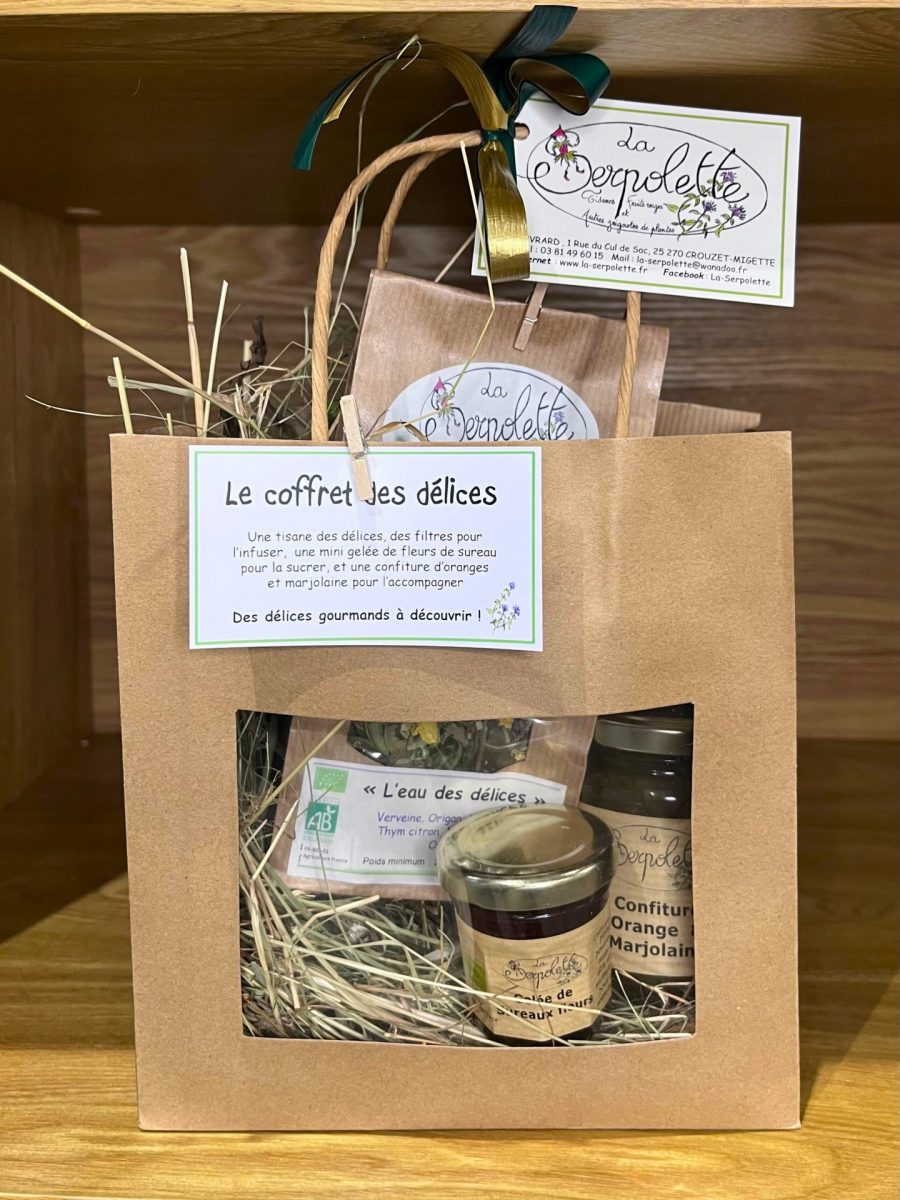 - La Serpolette : coffret des délices avec tisane, une mini gelée de fleurs de sureau ainsi qu’une confiture d’oranges et marjolaine, parfait pour offrir ! – 16€
